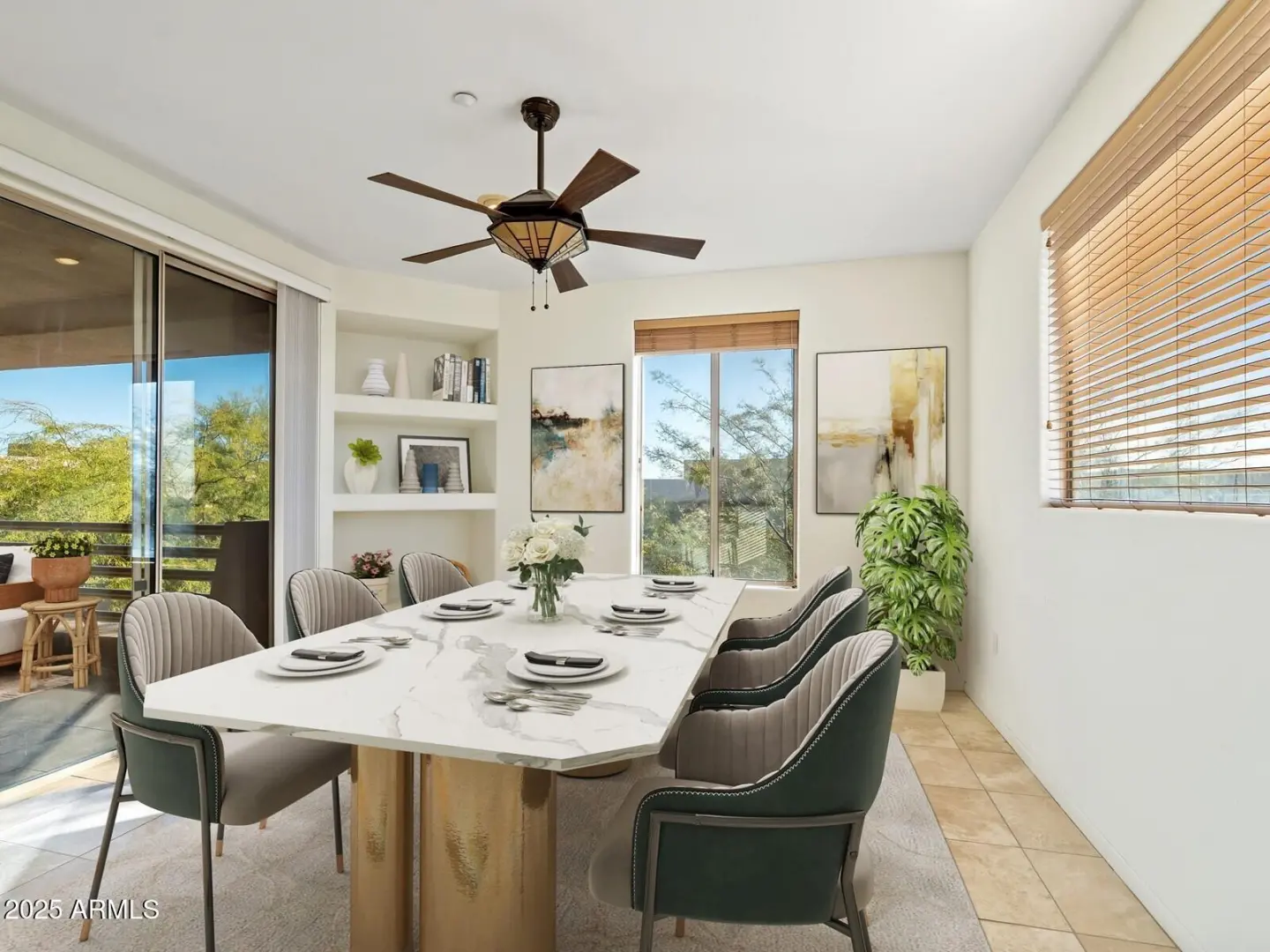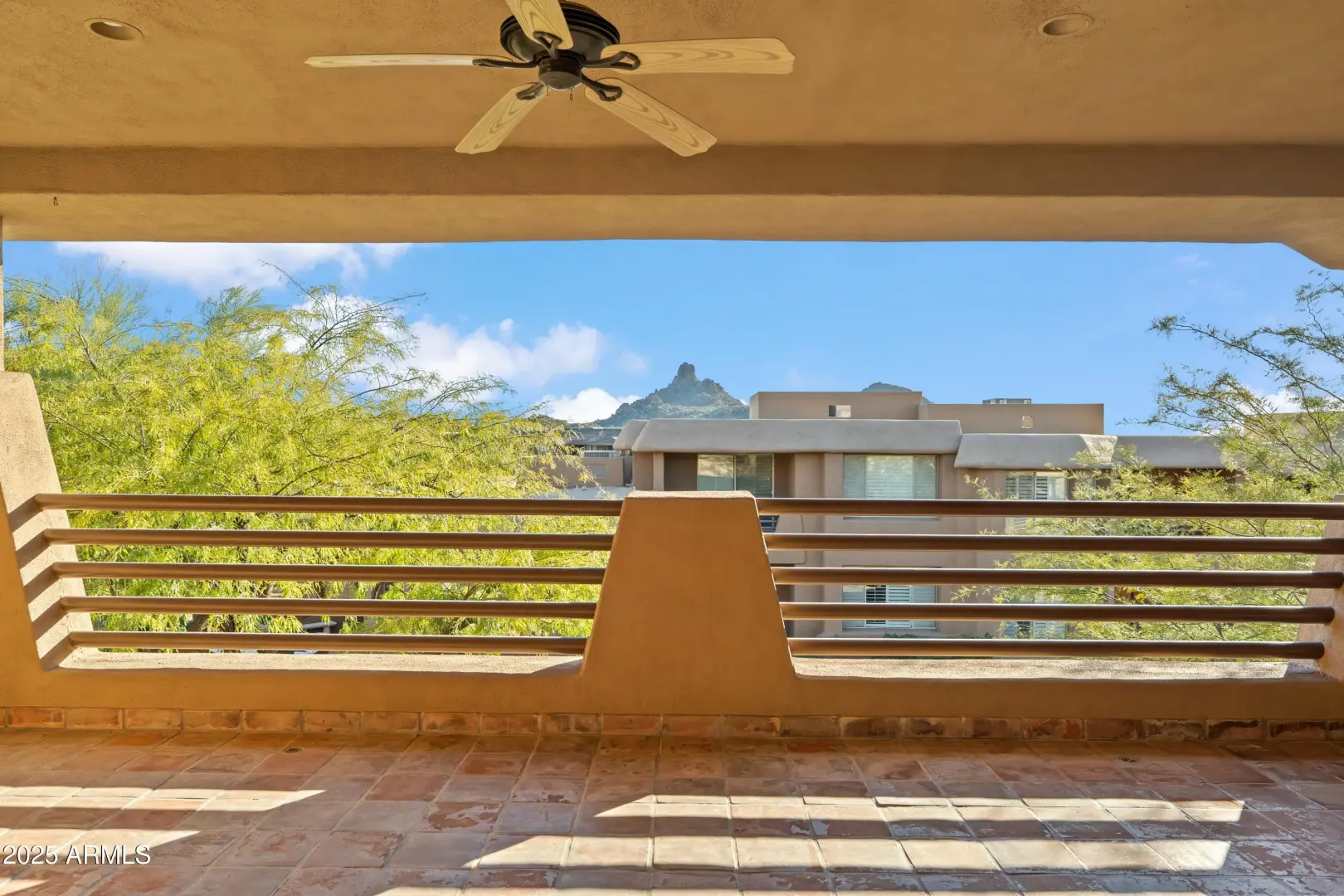 Within a Gated Community, built within the boulders, capturing spectacular views of Pinnacle Peak, city lights and fabulous Arizona sunsets. This single-story unit is on the second level; like a penthouse, serviced by a private elevator from the garage. Its open floor plan features a spacious kitchen tiled granite counters and a breakfast bar. The living and dining rooms feature decorative niches and a gas fireplace. Travertine floors in living areas. The spacious Saltillo-tiled covered balcony overlooks Pinnacle Peak. Walking distance to the award-winning Troon North Golf club, and community pool. The community offers a private park with tennis/basketball courts along with a playground area. There is an additional 10'x3.5' storage room by the 2-car parking garage. Easy to preview...