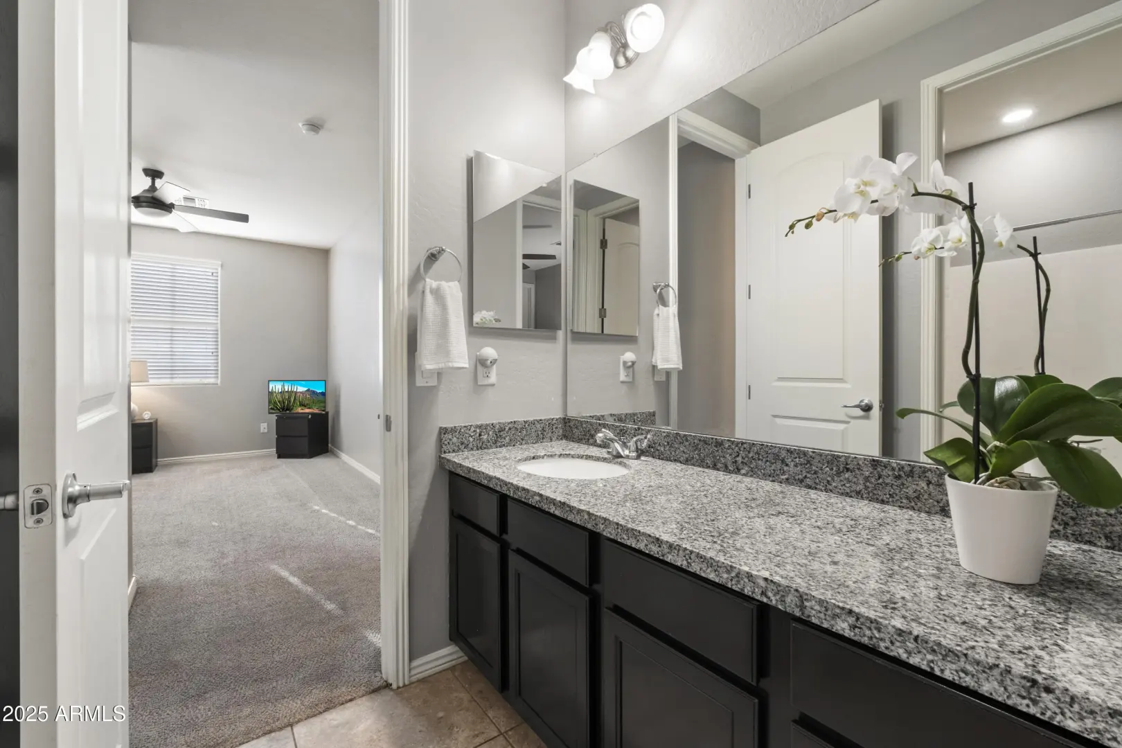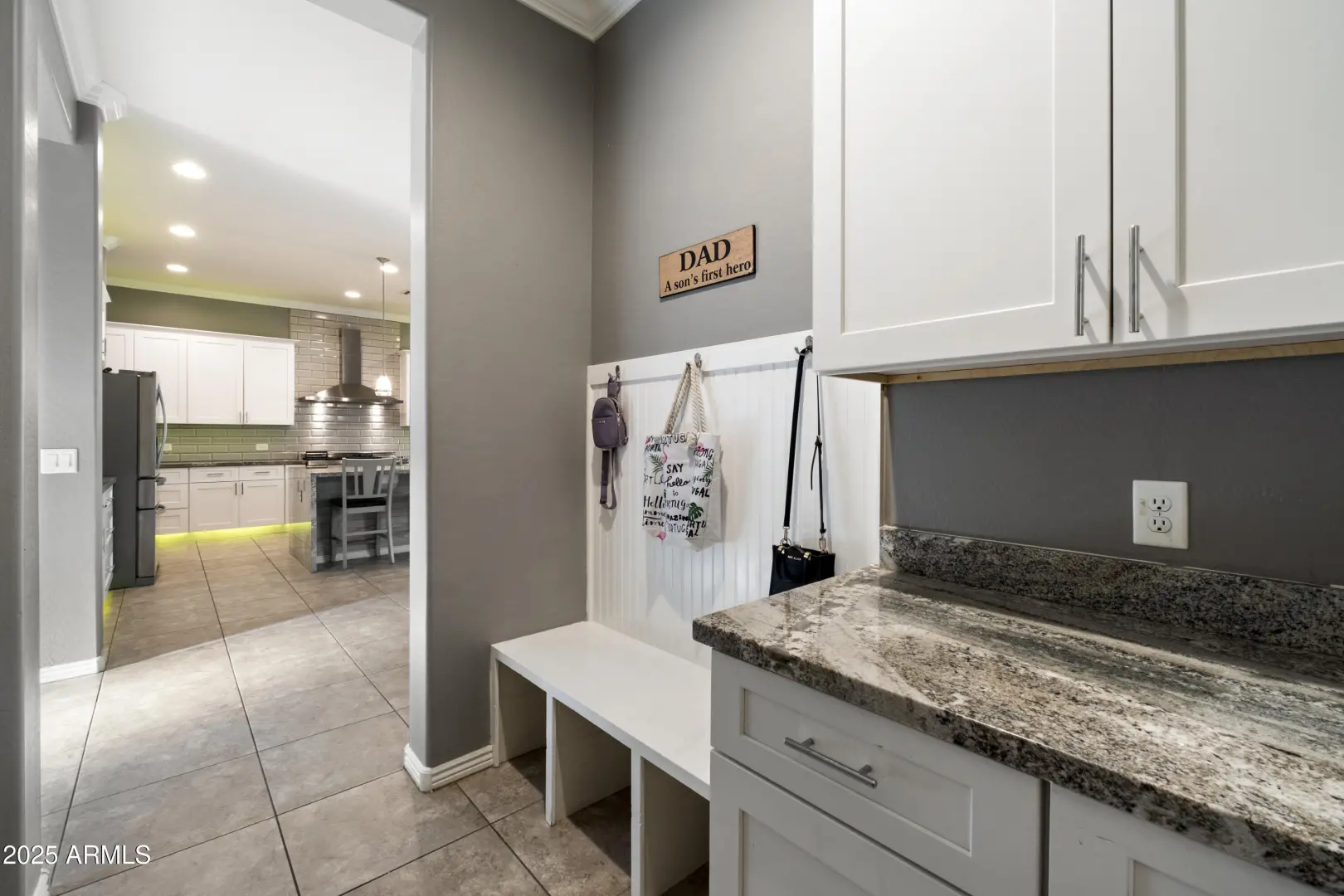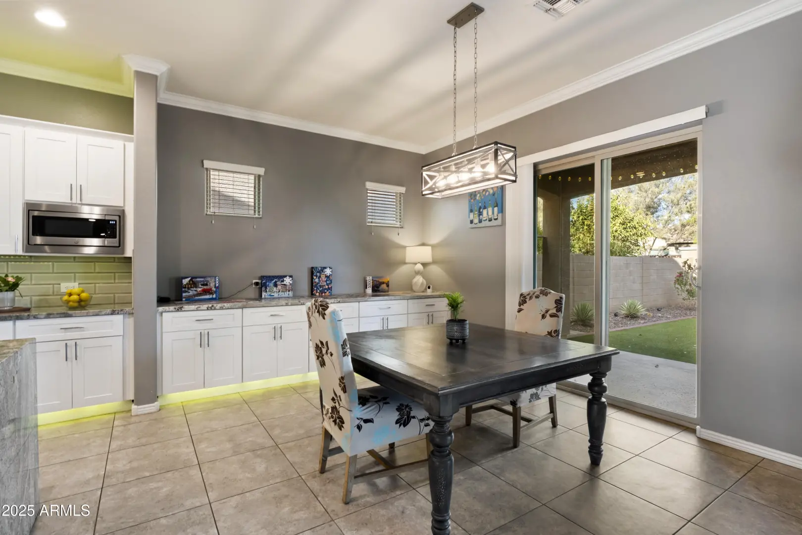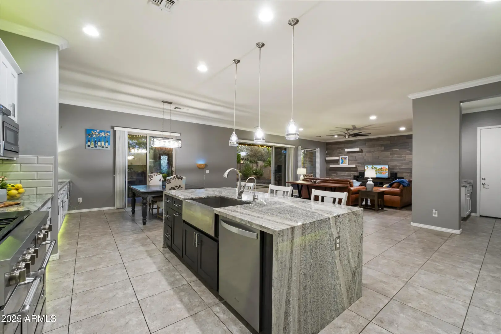 Come experience this beautifully upgraded home located in coveted The Bridges. From the moment you step through the stunning iron front door, this home is sure to impress. The 2-story entry features a striking spiral staircase. The home has been thoughtfully updated with a gorgeous new chef's kitchen and new crown molding downstairs. Upstairs, you'll find a haven for rest and relaxation, including a luxurious primary suite, freshly painted bedrooms, updated bath, and a family game room. The large 3-car garage has epoxy flooring/shelving and there is bonus garage with AC for the perfect home gym. Enjoy Arizona living outdoors with the extended covered patio—ideal for gatherings. All in a family-friendly neighborhood close to parks, splash pads, fishing lake and top-rated schools.